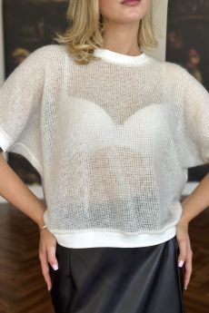 Bluză pulover lejeră, realizată din țesătură fină de angora. Materialul este semi-transparent, moale și extrem de confortabil la purtare. Modelul este prevăzut cu elastic la manșete, la tiv și la guler, pentru un plus de lejeritate și versatilitate. Ideală pentru ținute casual-chic sau de birou.