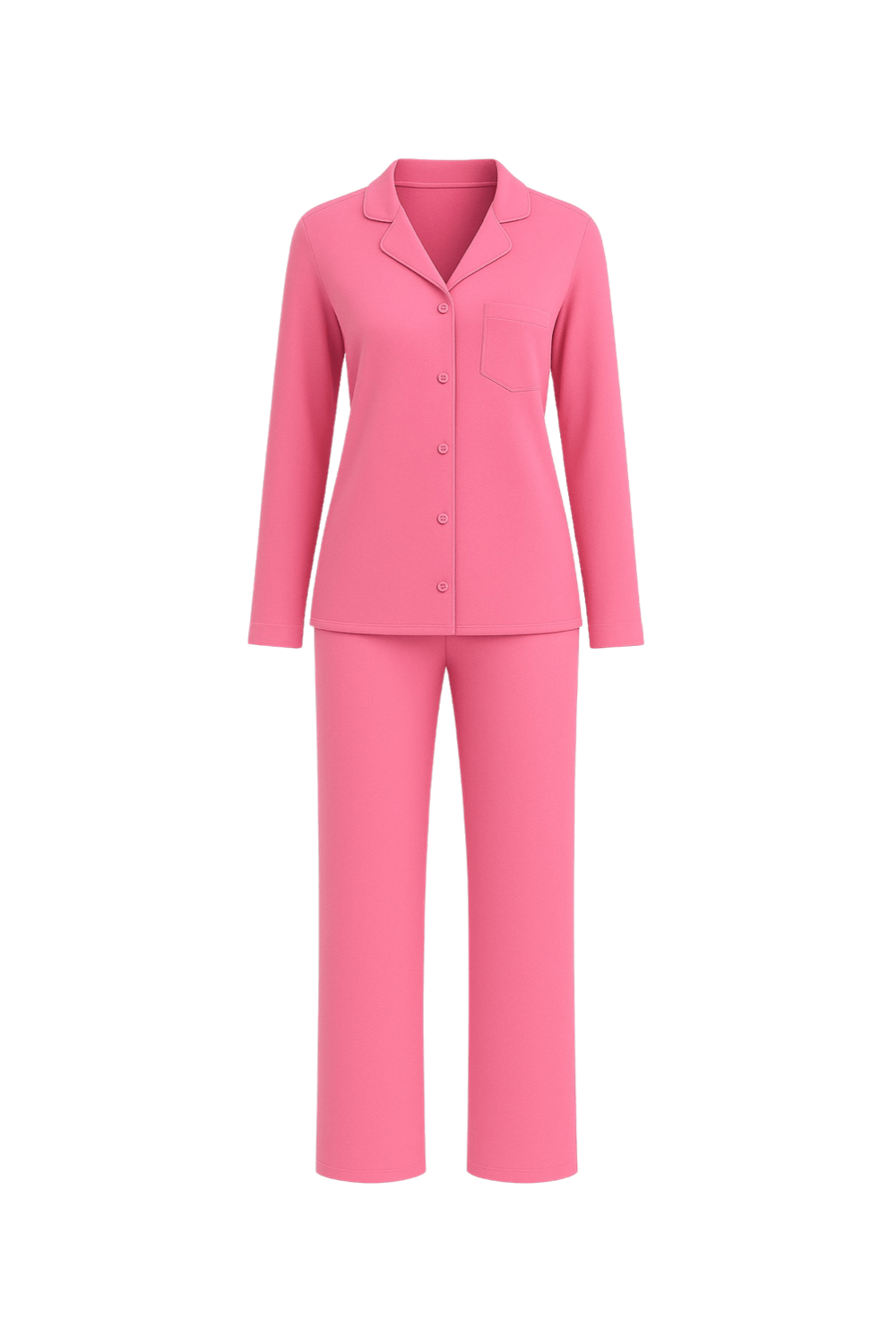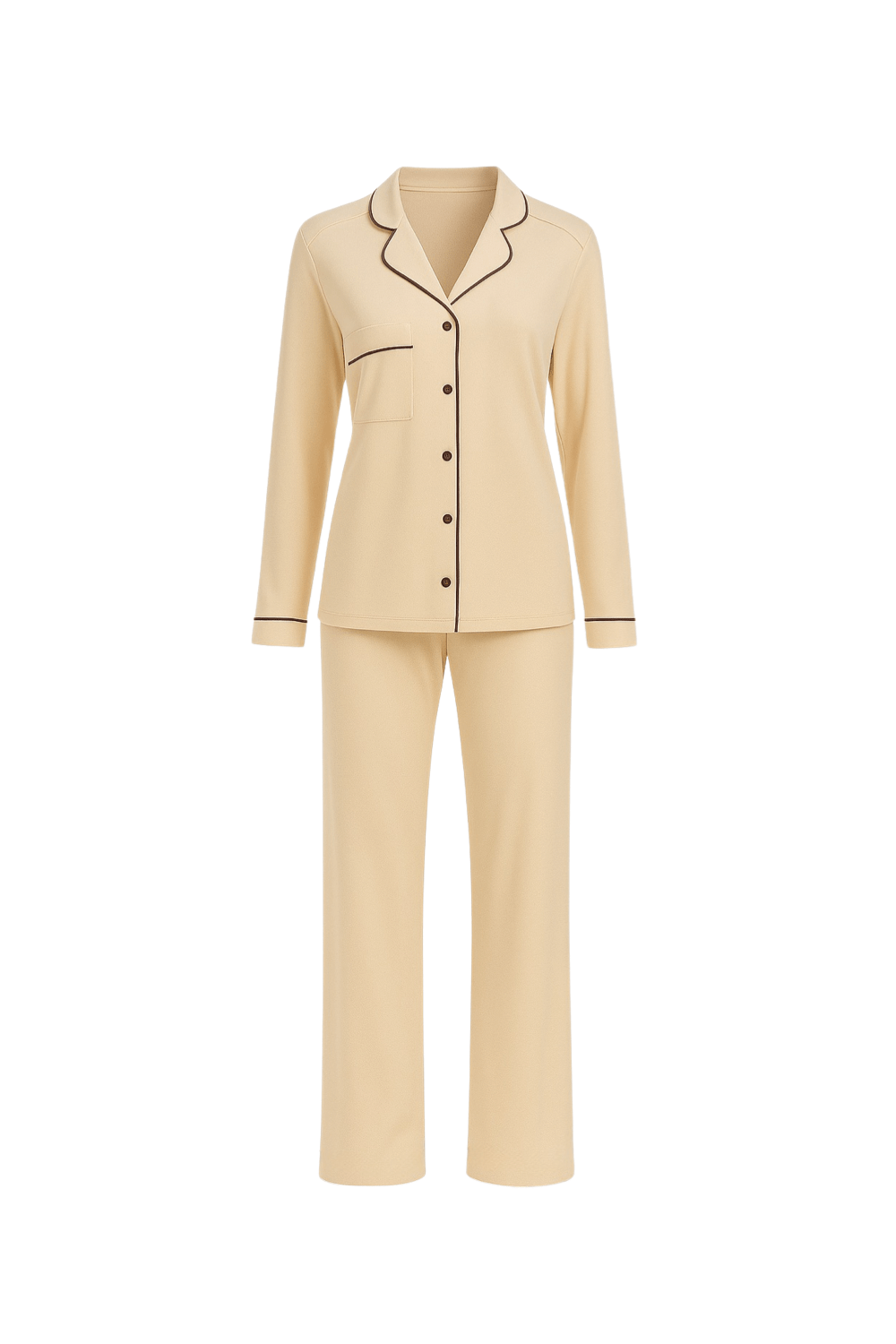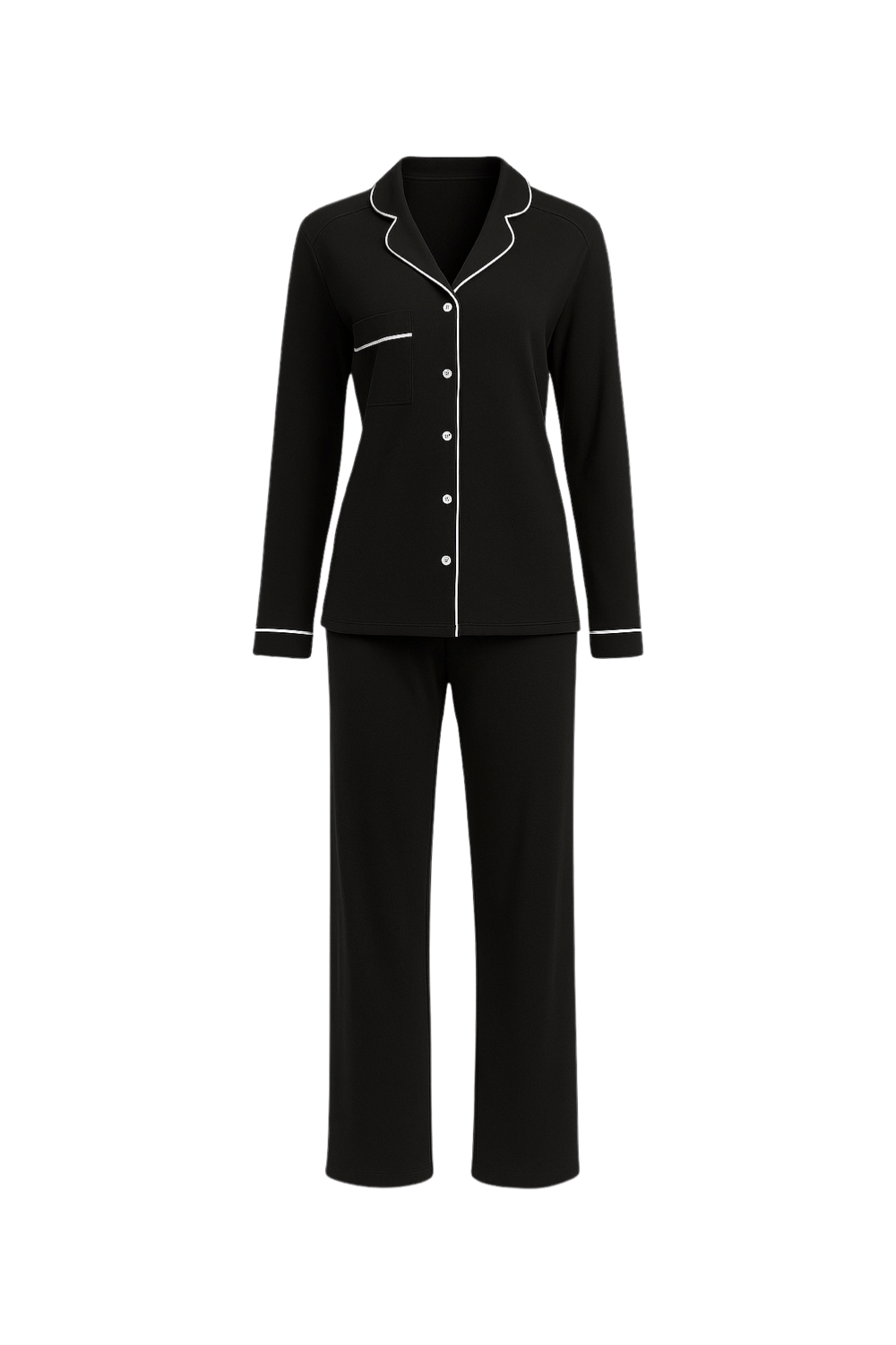 Pantalonii au o croială dreaptă, ușor evazată în partea inferioară, conferind lejeritate și confort sporit în purtare. Linia fluidă a pantalonilor completează armonios partea superioară, rezultând o pijama potrivită atât pentru odihnă, cât și pentru momentele relaxate petrecute acasă.