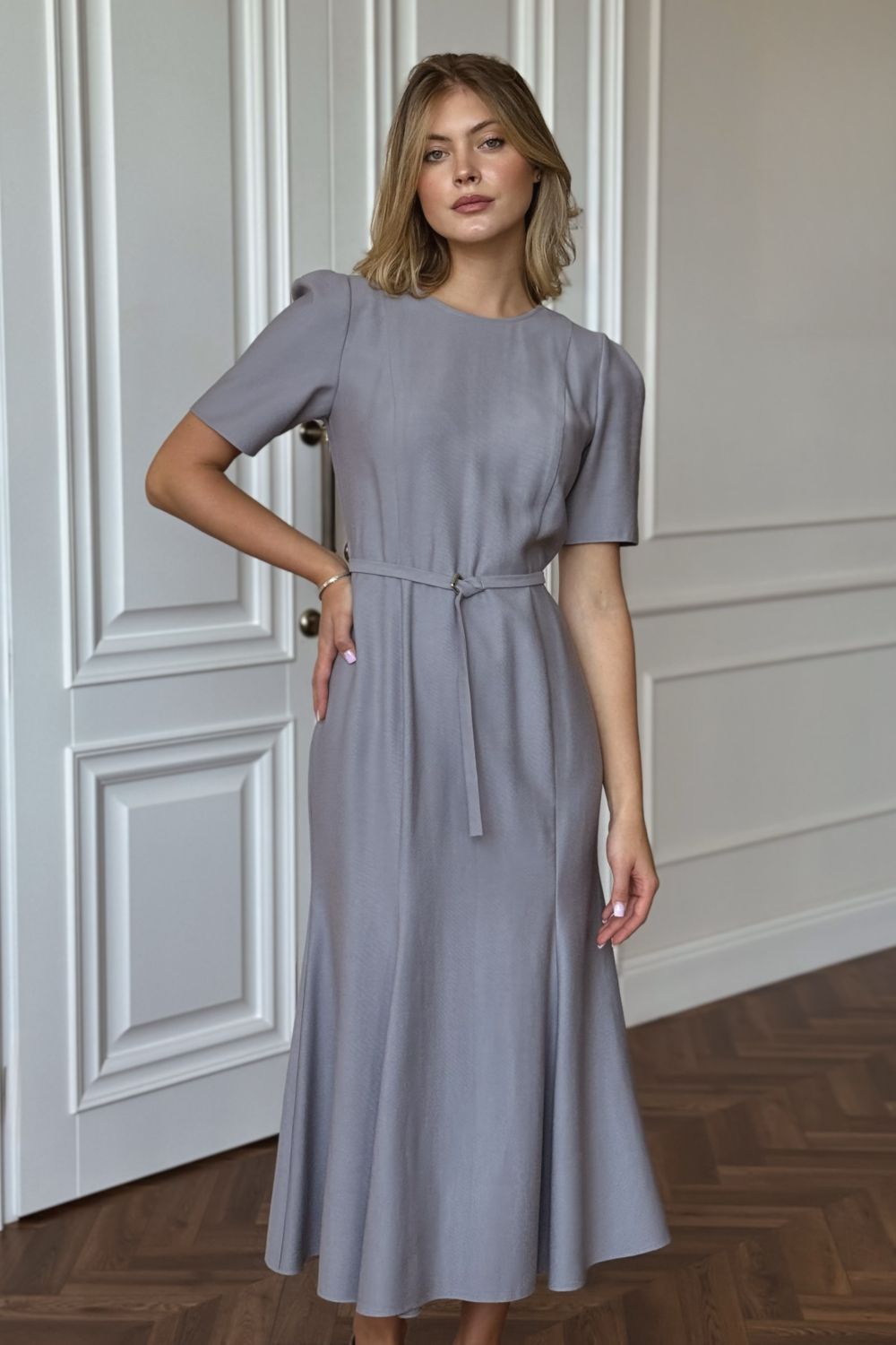 Rochie creion realizată din țesătură fină de crep italian, ideală pentru o ținută elegantă și rafinată. Croiala clasică urmează linia corpului și este pusă în valoare de o centură subțire în talie, care evidențiază silueta. Rochia are mâneci scurte tip tricou, oferind un plus de lejeritate și confort. Partea de jos rămâne dreaptă până la genunchi, apoi se deschide discret, creând o linie fluidă și feminină.