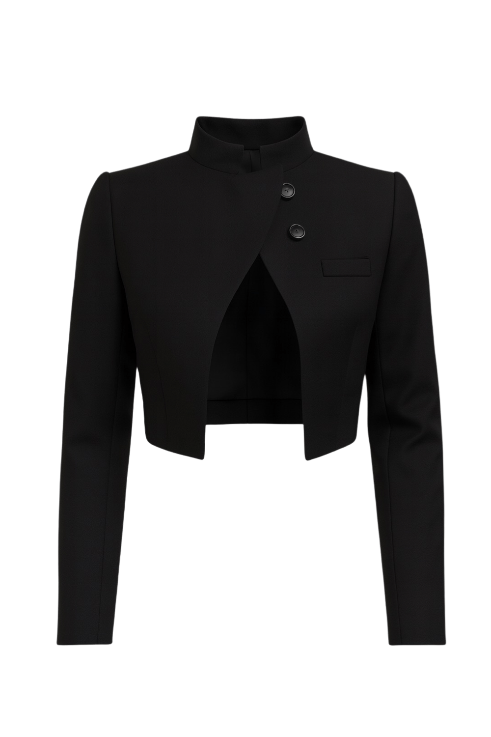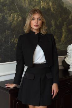 Sacou scurt, elegant, cu închidere cu doi nasturi poziționați subtil în zona bustului, lăsând partea de jos deschisă pentru un efect lejer. Guler dreptunghiular ridicat, scurt, care conferă rafinament. Croială clasică, perfectă pentru ținute elegante, fără aspect oversize.