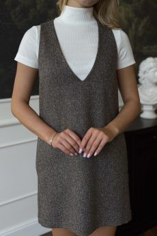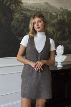 Sarafan cu design modern, de lungime mini, realizat dintr-un mix de lână italiană și vâscoză. Croiala cu decolteu adânc în formă de V îl face ideal pentru a fi purtat în straturi, peste cămăși, malete sau tricouri, oferind un look casual, dar stilat. Un model versatil, ușor de integrat în garderoba de zi cu zi.