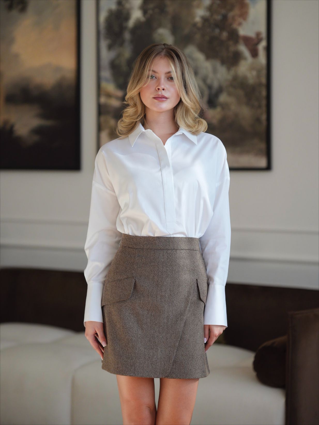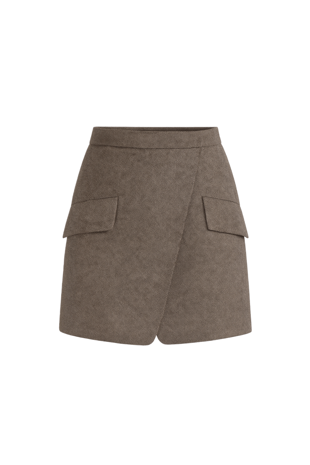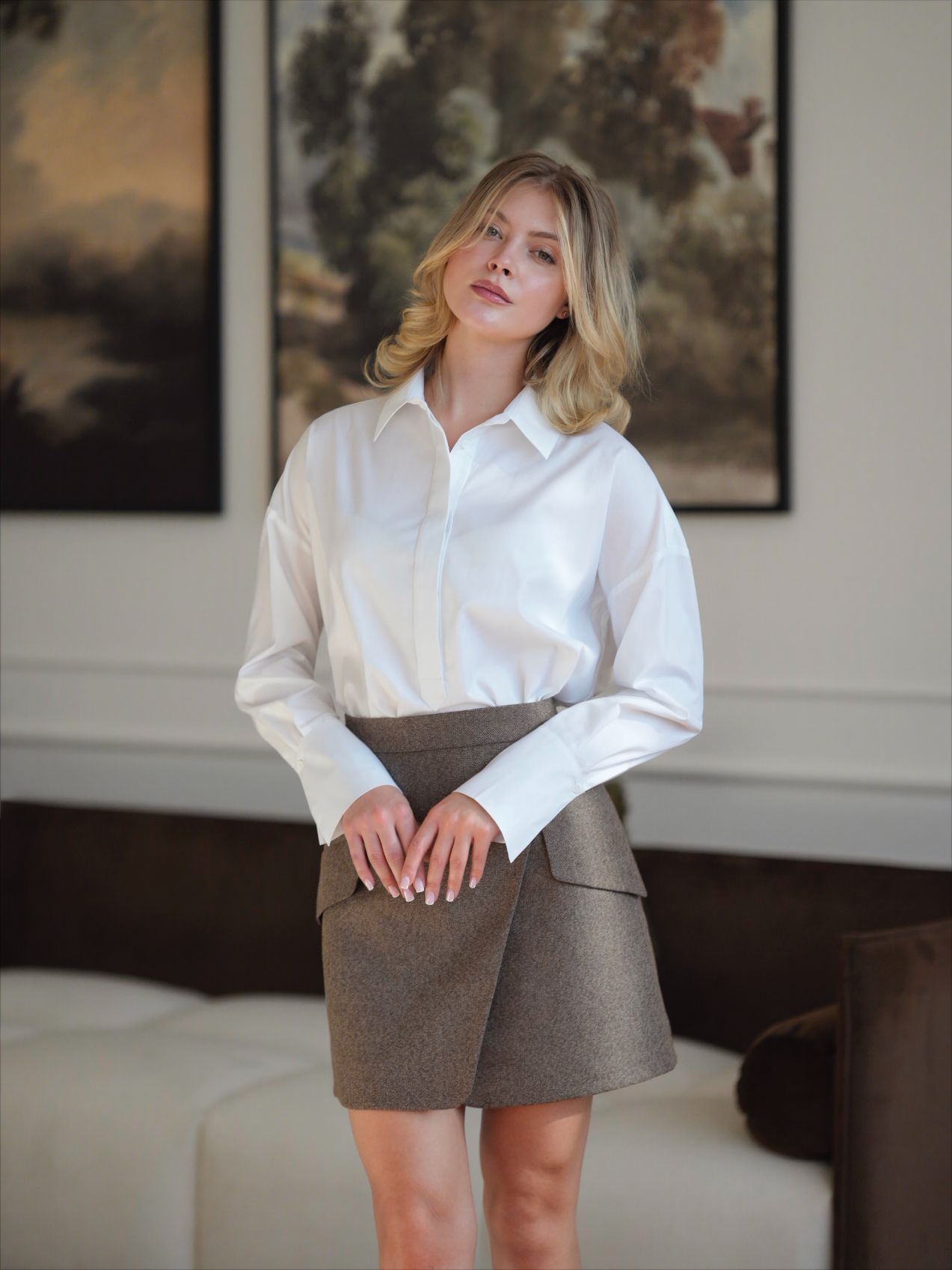 Короткая юбка современного кроя с запахом спереди. Имеет декоративные имитации карманов по бокам и широкий пояс, подчёркивающий талию и красиво формирующий силуэт.