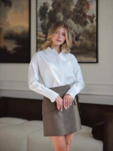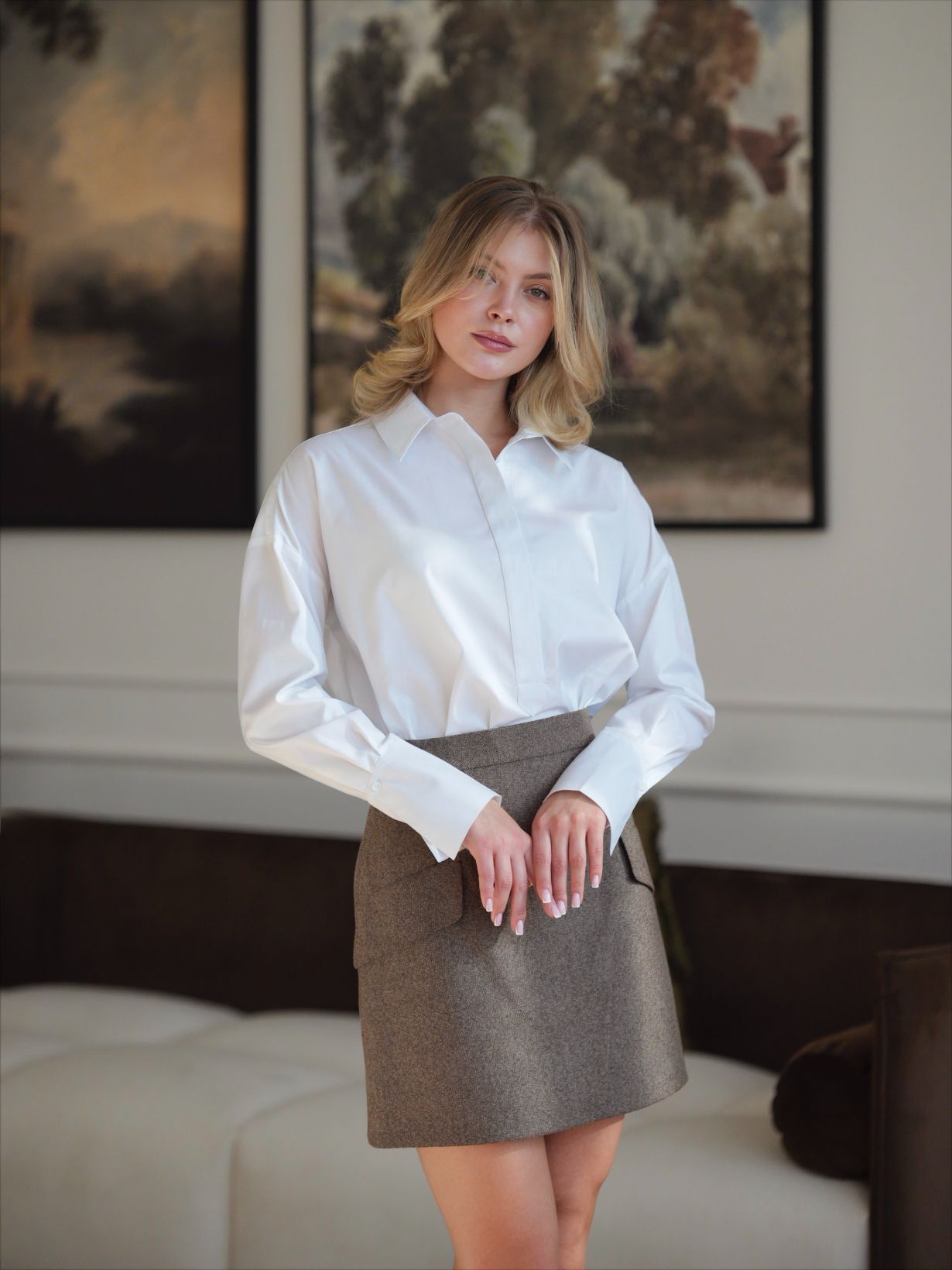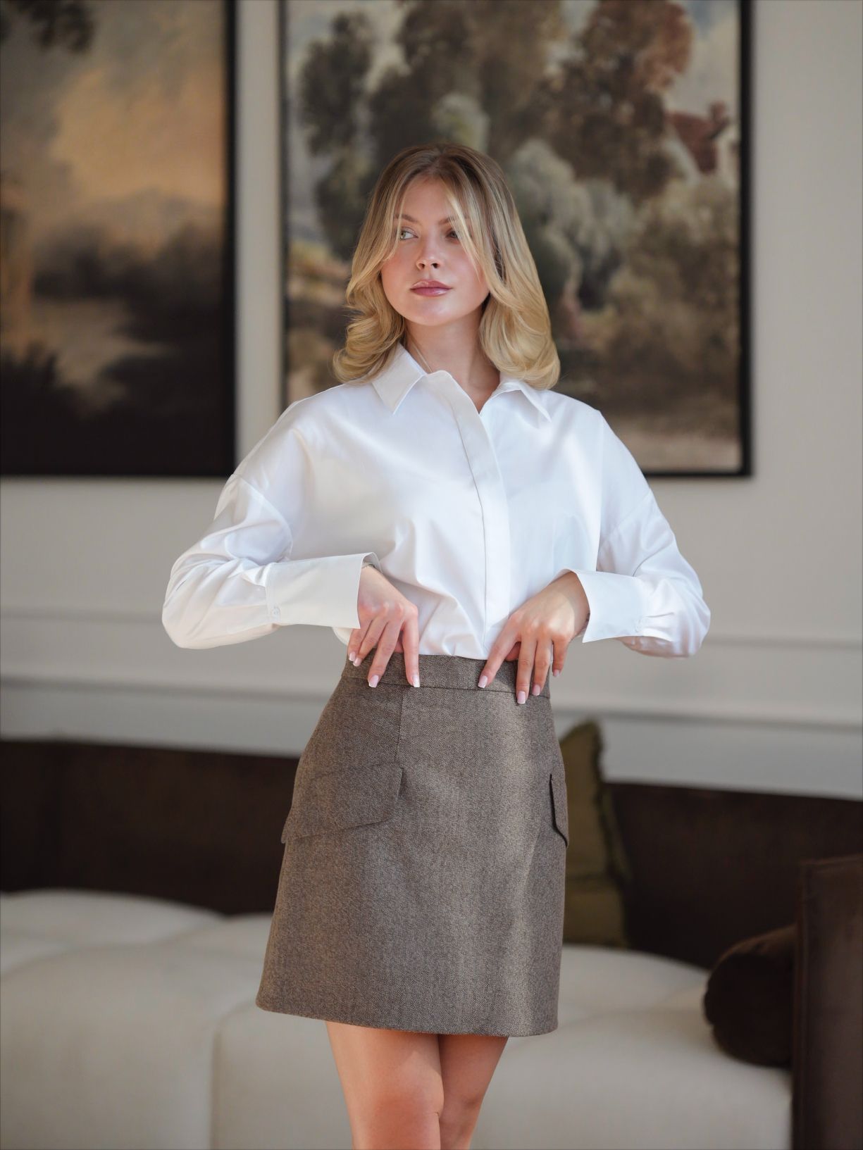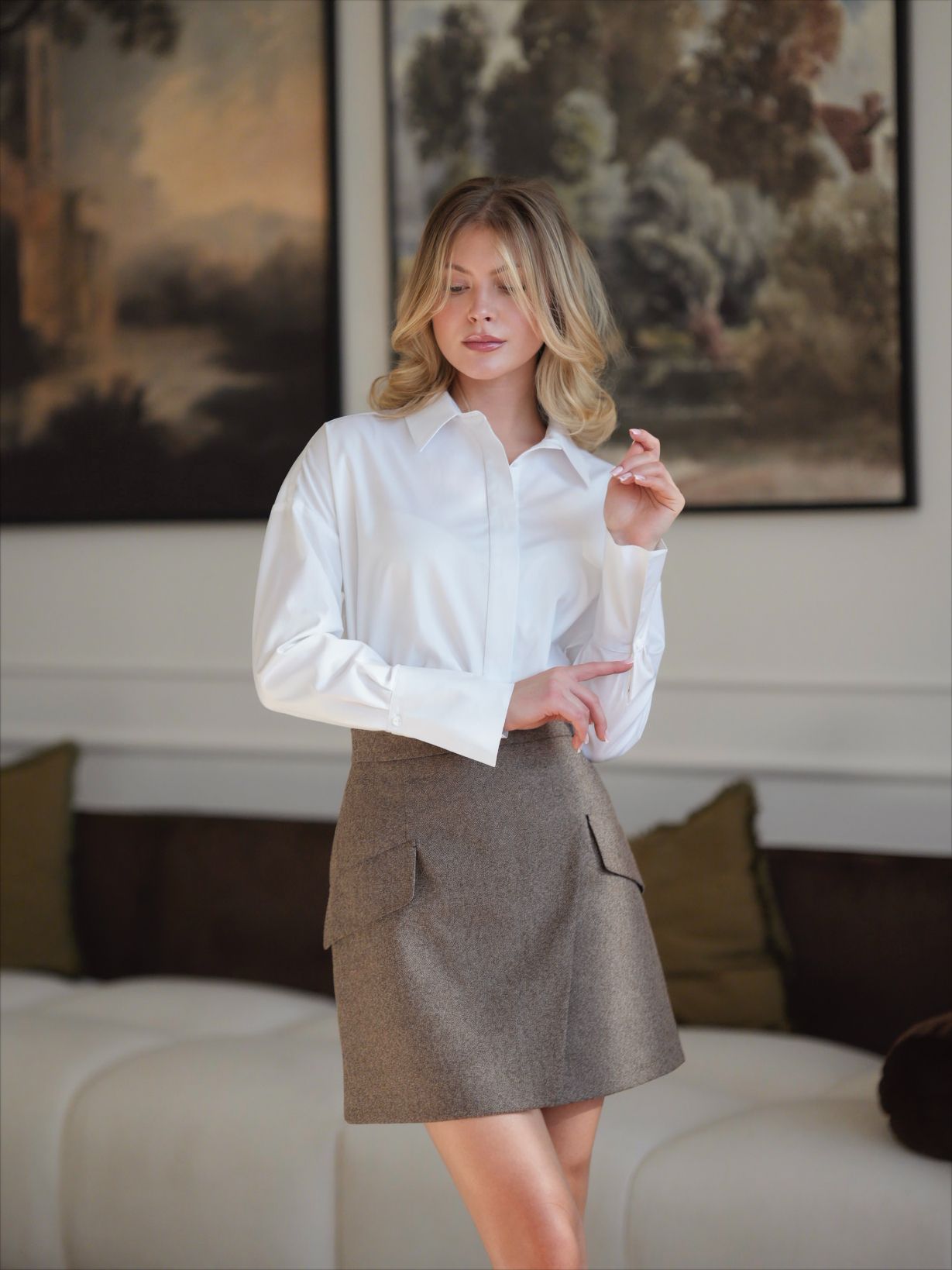 Короткая юбка современного кроя с запахом спереди. Имеет декоративные имитации карманов по бокам и широкий пояс, подчёркивающий талию и красиво формирующий силуэт.