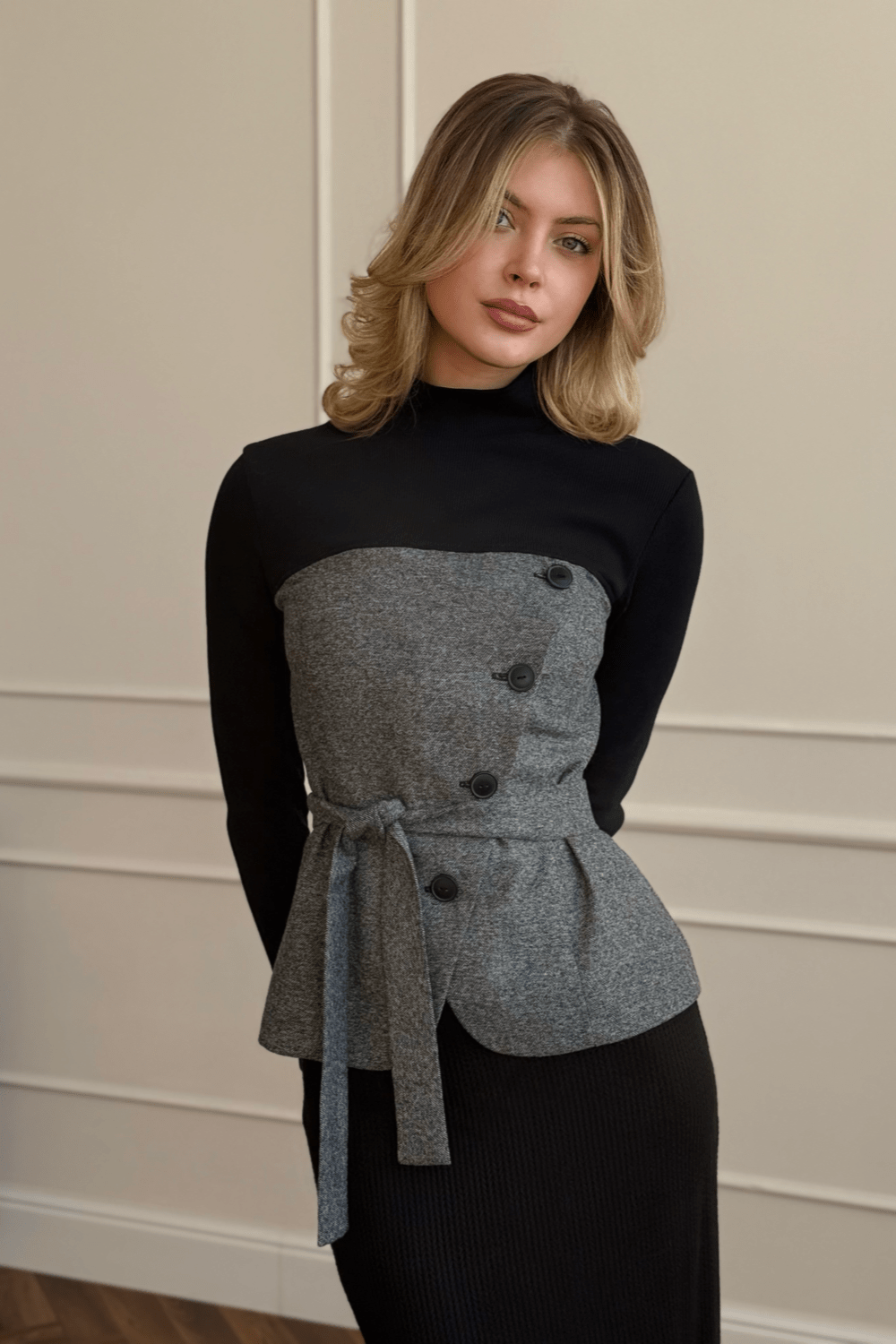 Верх представляет собой оригинальную водолазку: верхняя часть выполнена из чёрного трикотажа, а в зоне груди вставлена костюмная ткань, создающая эффект корсета с пуговицами и поясом из той же ткани.