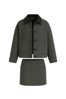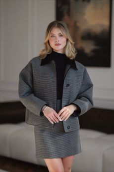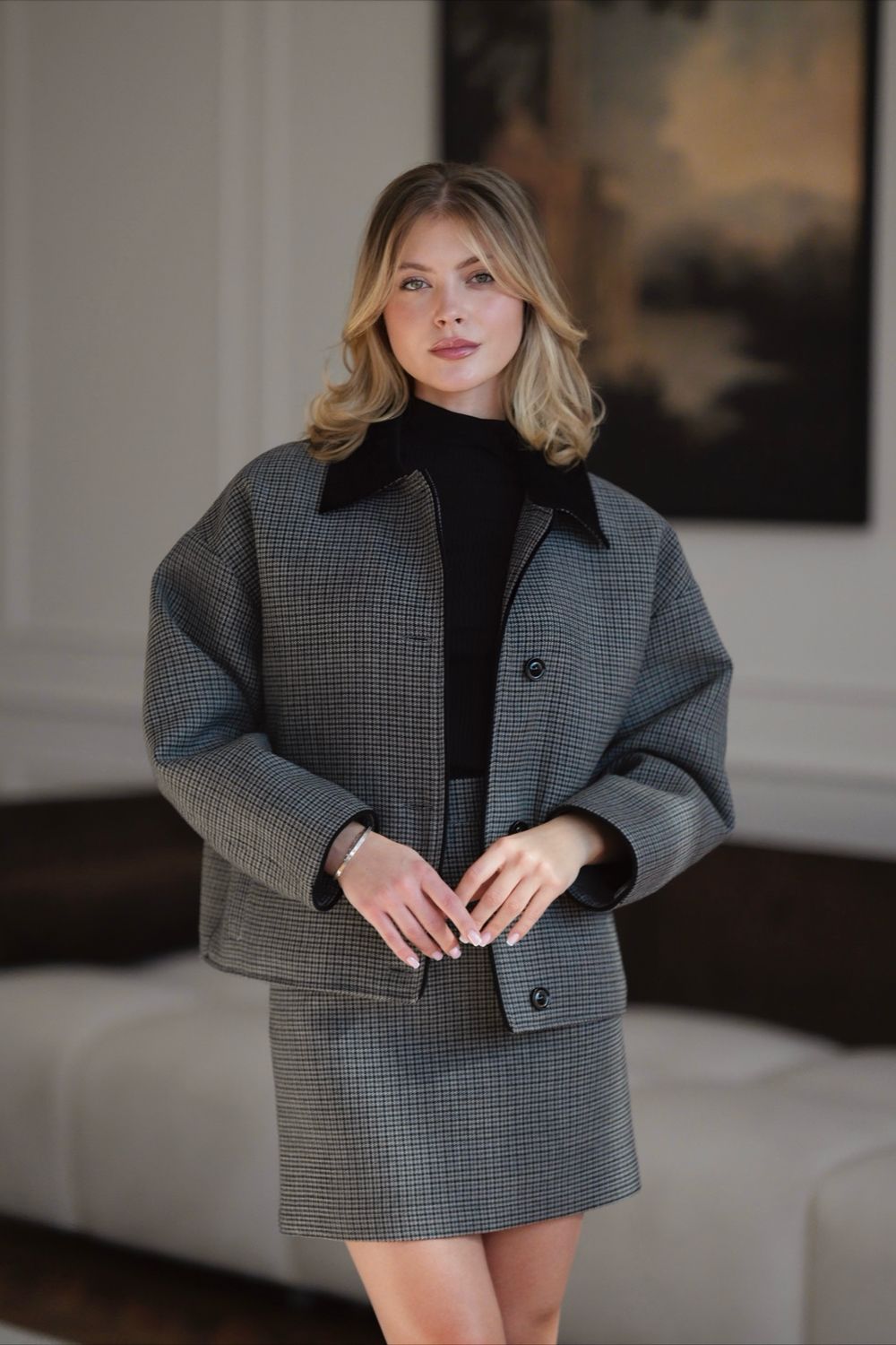 Костюм с мини-юбкой и курткой из костюмной ткани в клетку — это сочетание уюта и современного стиля.