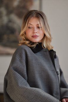 Куртка немного объёмная, тёплая и очень комфортная. Снаружи — костюмная ткань, внутри — стёганная подкладка, как у лёгких осенних курток. Чёрный воротник-рубашка и пуговицы спереди добавляют аккуратный акцент.