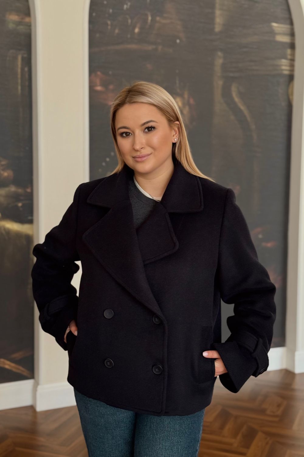 Короткое пальто с классическим кроем и современными деталями. Два ряда пуговиц (по две в ряду), два борта и декоративные ремешки на манжетах. Классические плечи создают элегантный и сбалансированный силуэт — универсальная модель для холодного сезона.